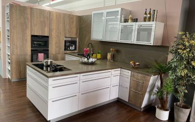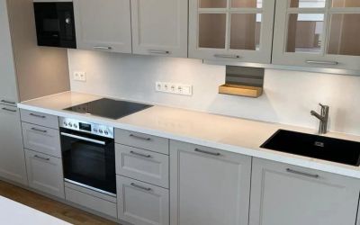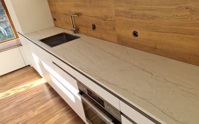 Arbeitsplatten und Rückwände aus Neolith "Pulpis", mit Gehrungskante, Spüle Unterbau und Kochfeld flächenbündig