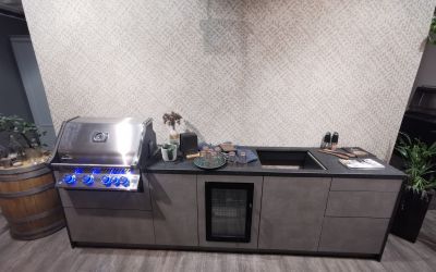Outdoorküche bestehend aus Arbeitsplatte und Wangen, mit Naturstein "Ice Black / Black Ice", Oberfläche waterjet, mit Gehrungskante