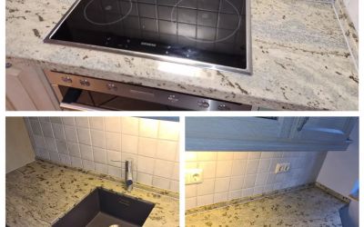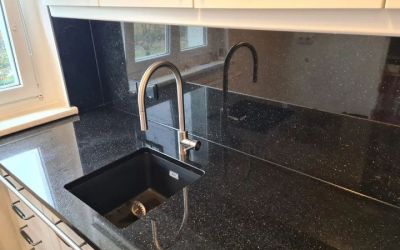 Arbeitsplatte und Rückwand aus Naturstein "Star Galaxy", 2/3cm massiv, Oberfläche poliert mit poliertem Ausschnitt für Unterbauspüle