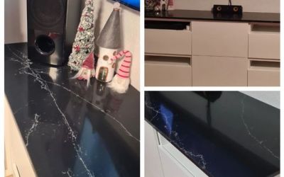 Arbeitsplatten aus Naturstein "Marinace Black", 3cm poliert, Kochfeld und Spüle aufgesetzt mit Wandanschlußprofil 3x2cm