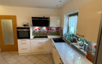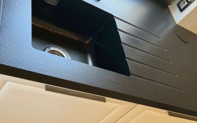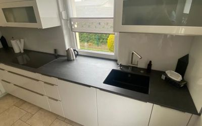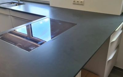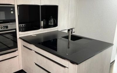 Arbeitsplatten aus SenSa "Moak Black" , Oberfläche satiniert, 4cm Gehrungskante, Spüle Unterbau mit Abtropfrillen, Auflagekochfeld und Twiststeckdose
