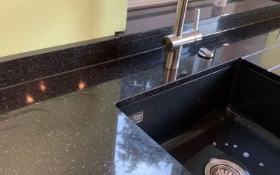 Arbeitsplatten aus Naturstein "Nero Assoluto Z", Kochfeld und Spüle flächenbündig
