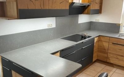 Arbeitsplatten aus Quarzkompositstein / Silestone "Charcoal Soapstone", Oberfläche suede, 2cm stark, Spüle Unterbau, Kochfeld flächenbündig