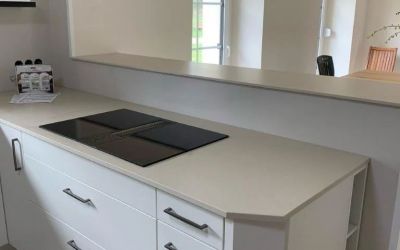 Arbeitsplatte aus Naturstein "Imperial White", 3cm poliert, Kochfeld und Spüle Auflage