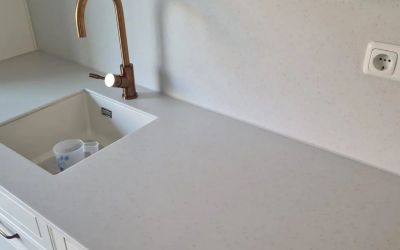 Arbeitsplatten und Rückwände aus Corian "Linen", 12mm stark, Spüle Unterbau, Kochfeld Auflage