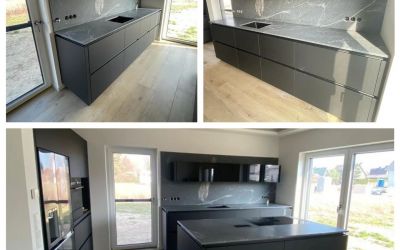 Arbeitsplatten und großformatige Rückwände aus Naturstein "Elegant Grey", Oberfläche satiniert, 2cm stark, Kochfeld und E-Port flächenbündig Spüle Unterbau.