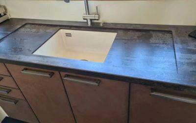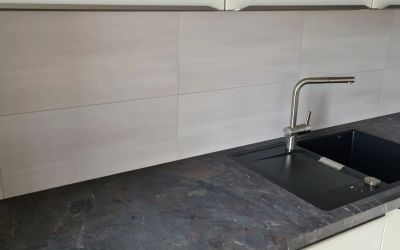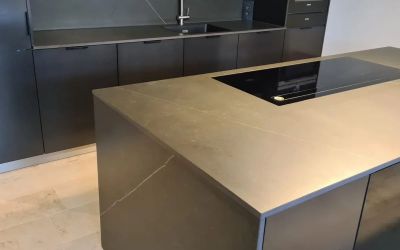 Arbeitsplatte aus Dekton Trilium, mit Unterbaubecken und umlaufender aktiven Arbeitsfläche, Sichtkanten auf Gehrung 4cm hoch