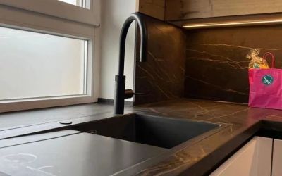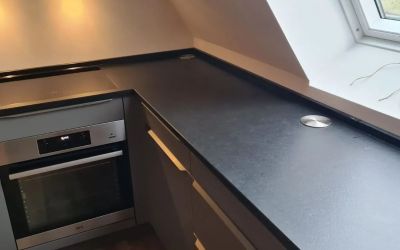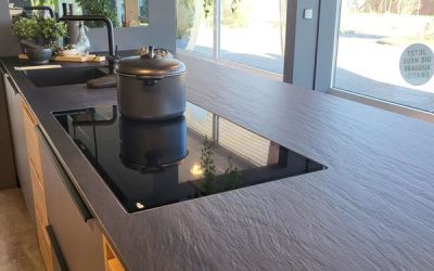 Arbeitsplatte aus Laminam "Nero a Spacco", in einer tollen Schieferoptik, Kochfeld & Spüle flächenbündig verplant, 2cm massiv