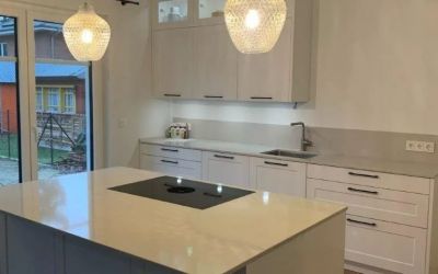 Arbeitsplatten und Rückwand aus Silestone "Desert Silver", Oberfläche poliert, K1 gefast, Kochfeld flächenbündig, Spüle Unterbau
