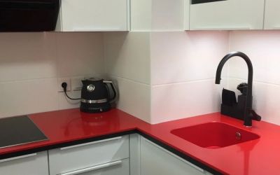 Arbeitsplatten aus Silestone "Rosso Monza", 12mm poliert mit integriertem Becken Typ DUE34, Kochfeld Auflage