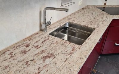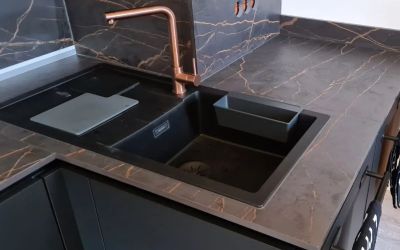 Arbeitsplatten aus Naturstein "Shiwakashi", Oberfläche poliert, Kante K2-Z, Spüle Unterbau mit seitlichen Ablaufrillen, Kochfeld flächenbündig