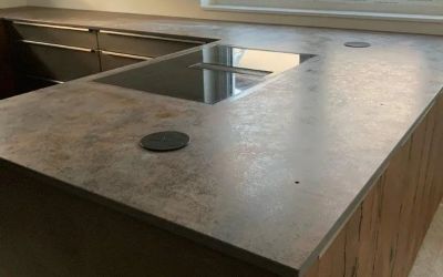 Arbeitsplatten und Rückwände aus Dekton Laurent, 2cm stark, Kochfeld flächenbündig, Spüle als Auflage verbaut
