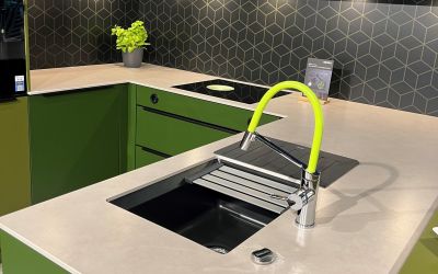 Die 12mm starke Arbeitsplatte aus Keramik Neolith PIETRA DI LUNA mit ihrer seidigen Oberfläche verleiht dieser Küche einen modernen Touch, während die moosgrünen Fronten für einen Hauch von Natur sorgen.