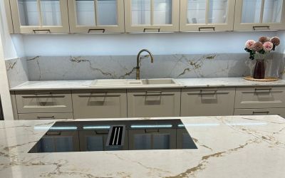 Die Arbeitsplatte und Rückwand aus Silestone VERSAILLES IVORY, mit polierter Oberfläche in 2cm Stärke verleiht dieser Küche einen Hauch von Eleganz und Raffinesse.