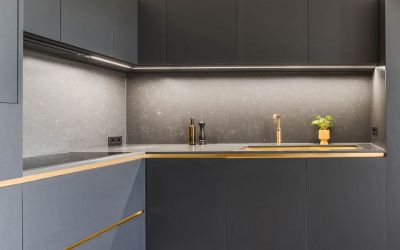 Im Fokus steht die Arbeitsplatte, die aus dunkler Keramik DEKTON FOSSIL gefertigt ist.
