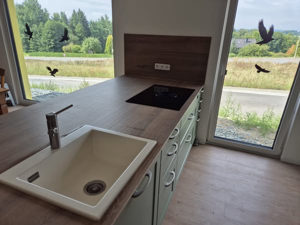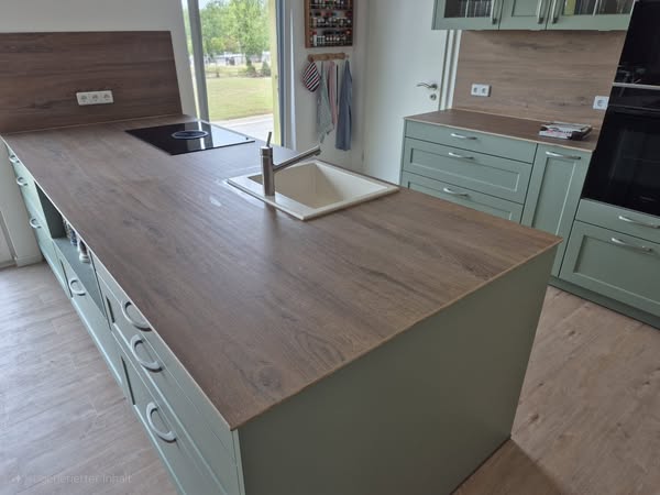 Ein wunderschöner Kontrast zu den grünen Fronten – perfekt abgestimmt auf den Holzboden - rustikale Optik mit moderner Funktionalität.