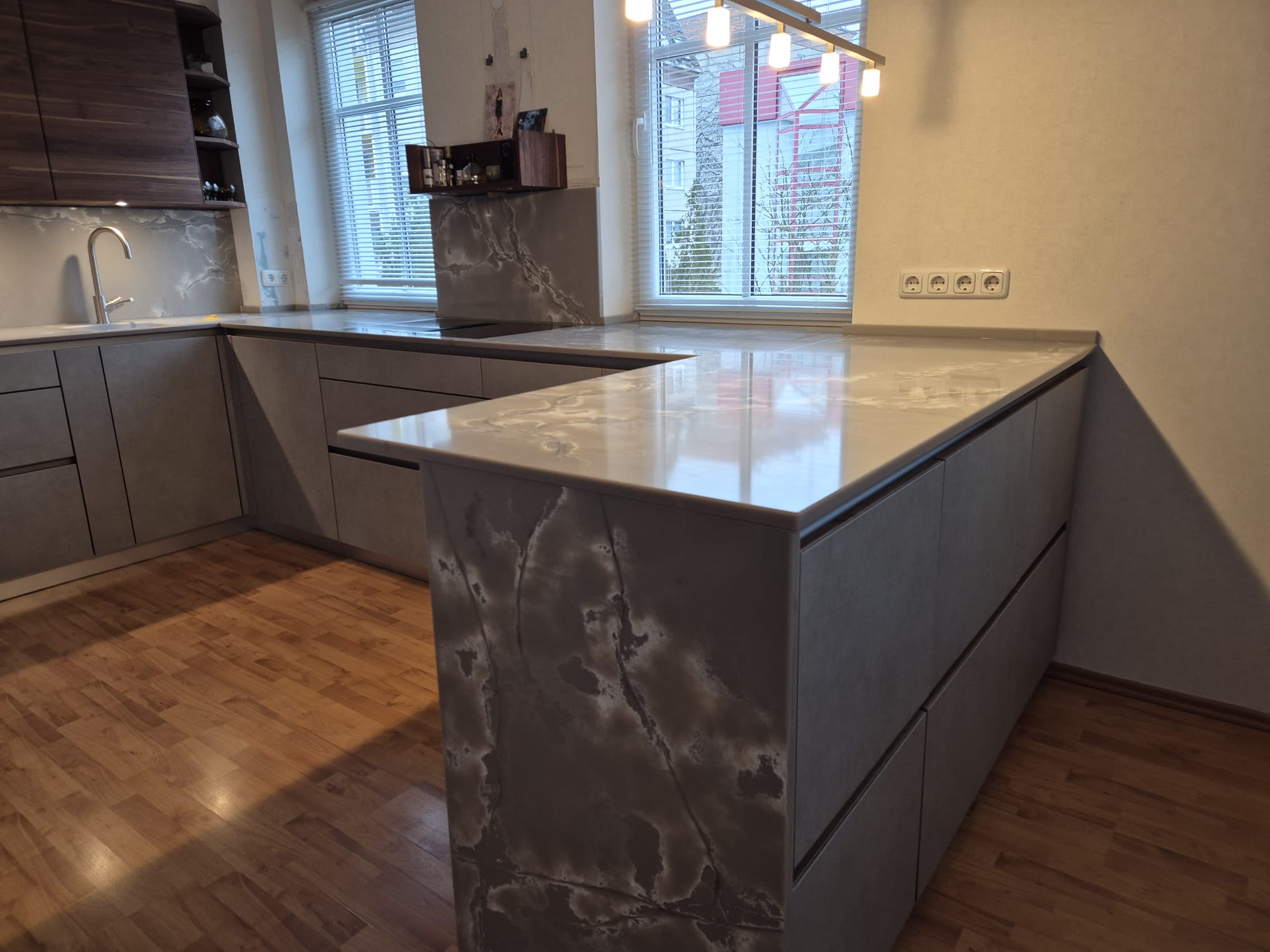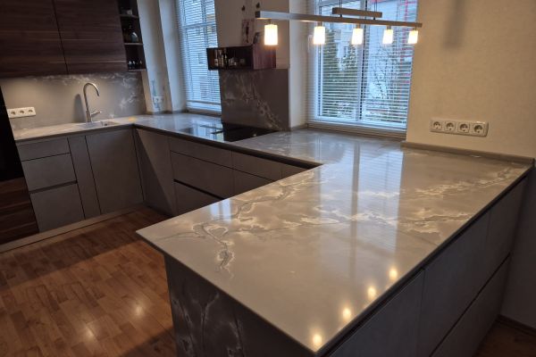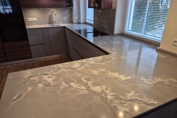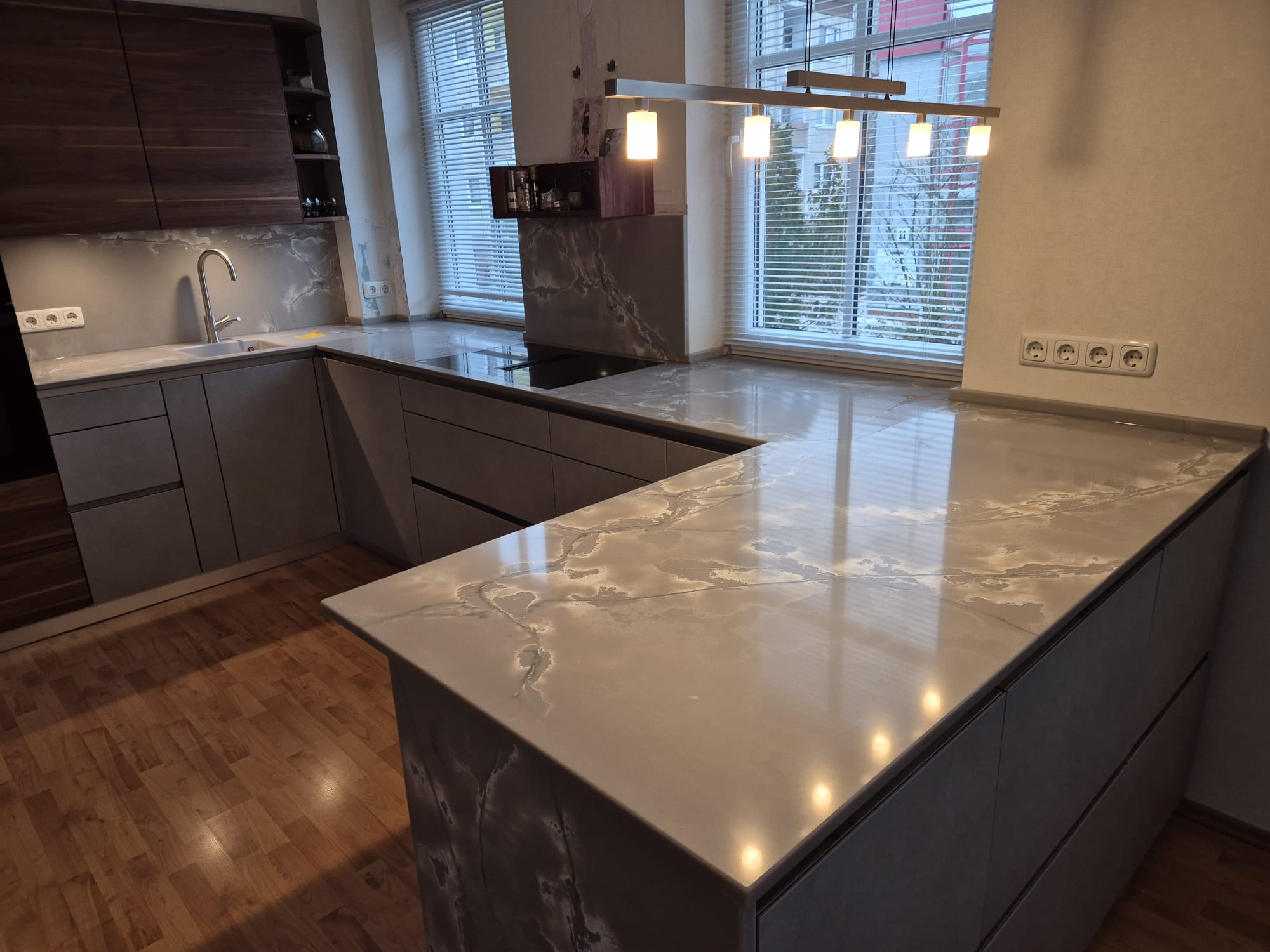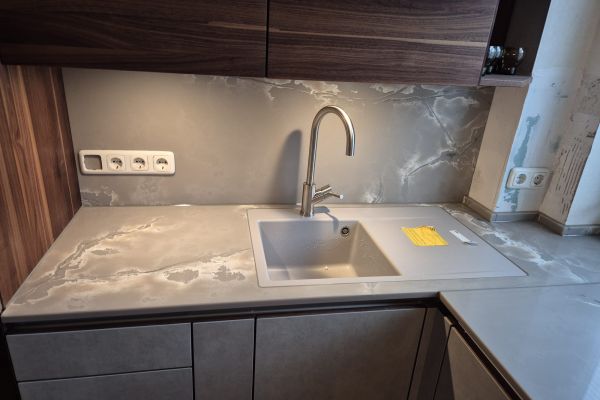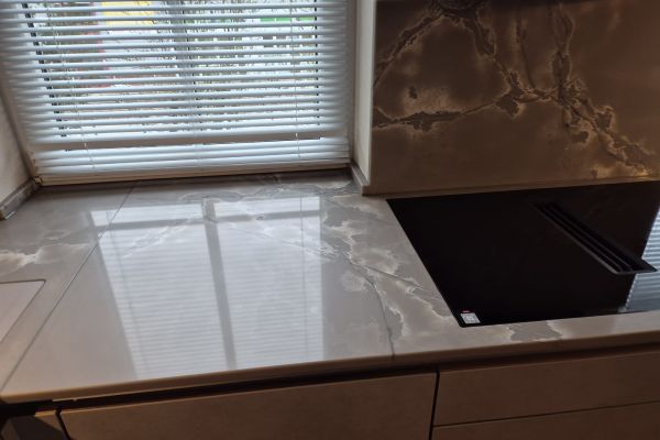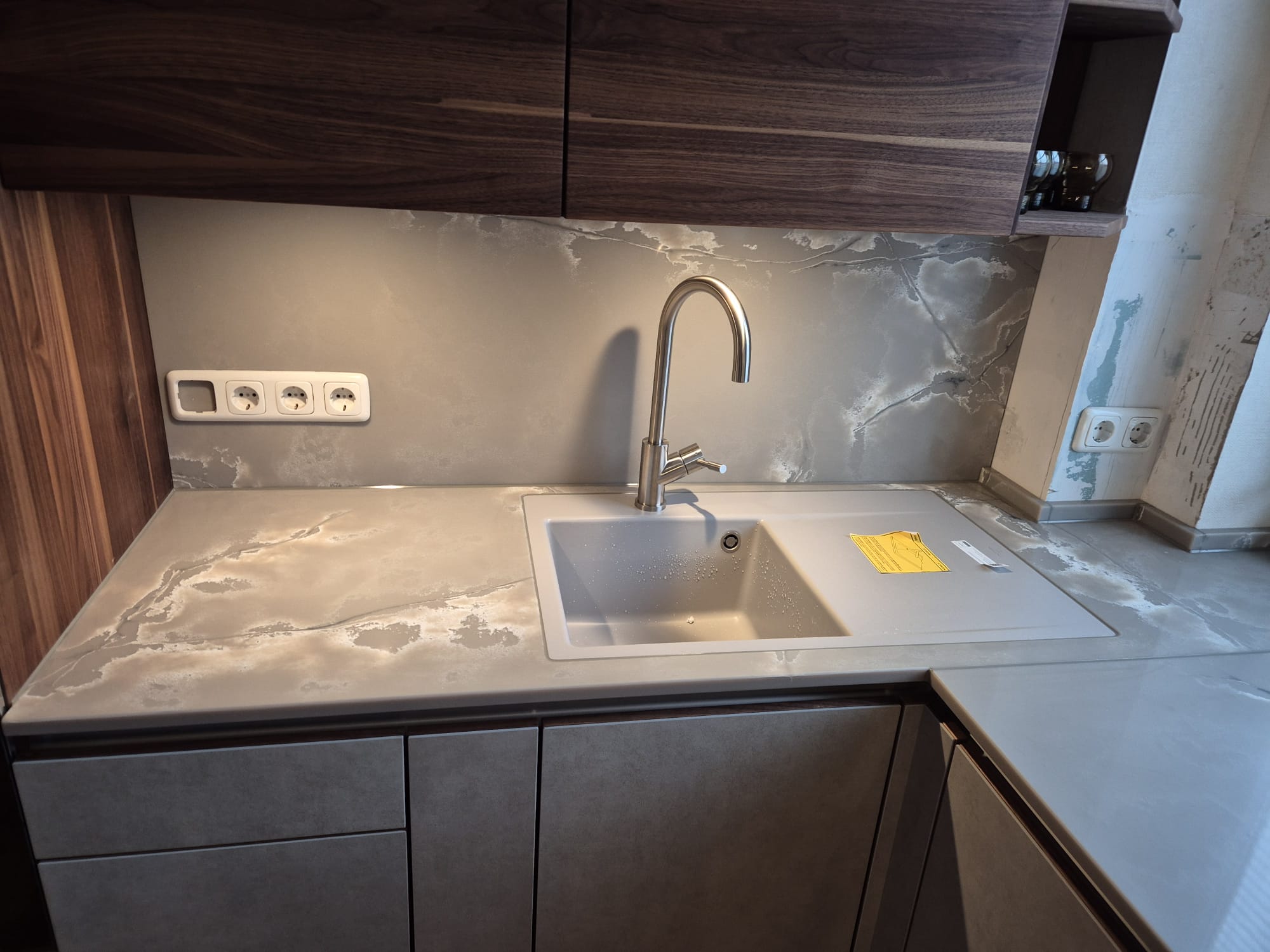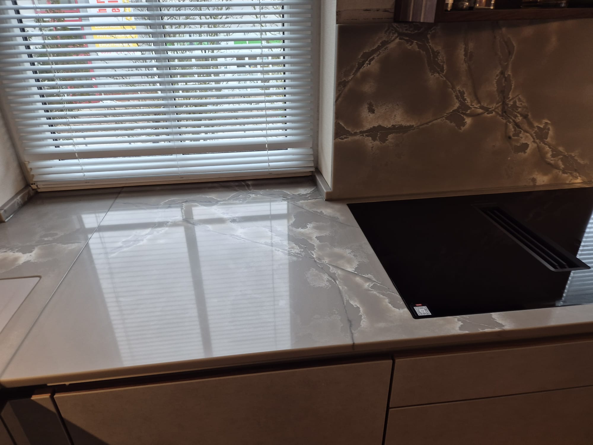 Arbeitsplatte, Wange und Rückwand aus Compac Ice White, 2 cm stark und poliert.