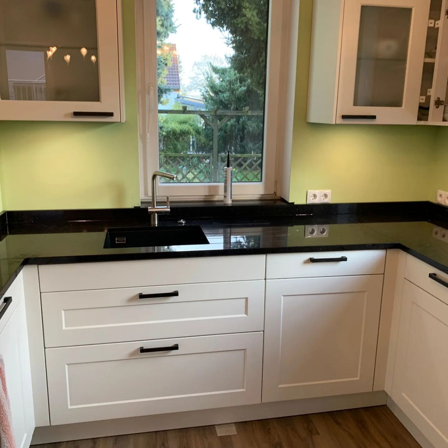 Arbeitsplatten und Wandanschlußprofil aus Naturstein "Galaxy Silver / Stargate", 3cm poliert, Kochfeld flächenbündig und Spüle Unterbau mit seitlichen Ablaufrillen