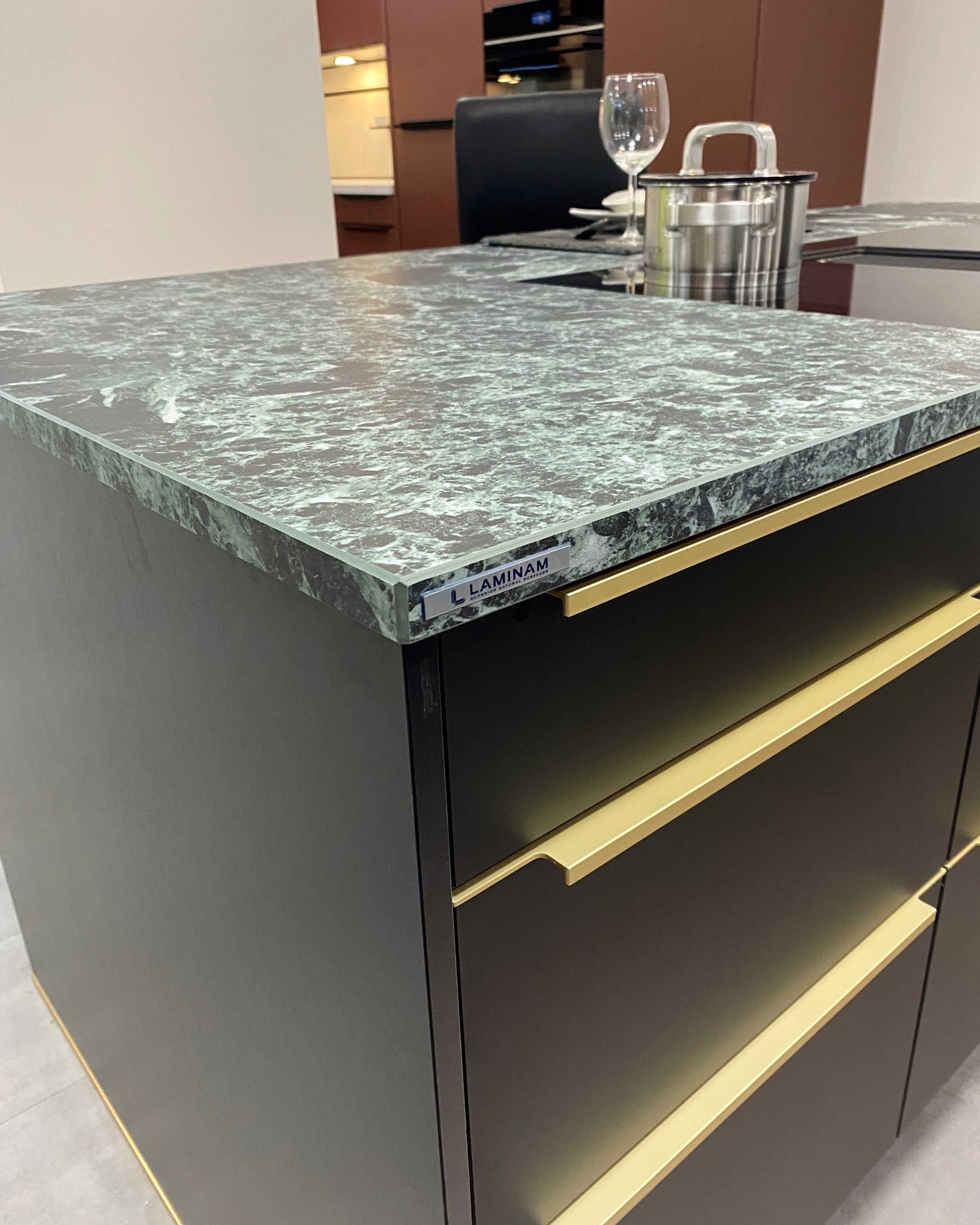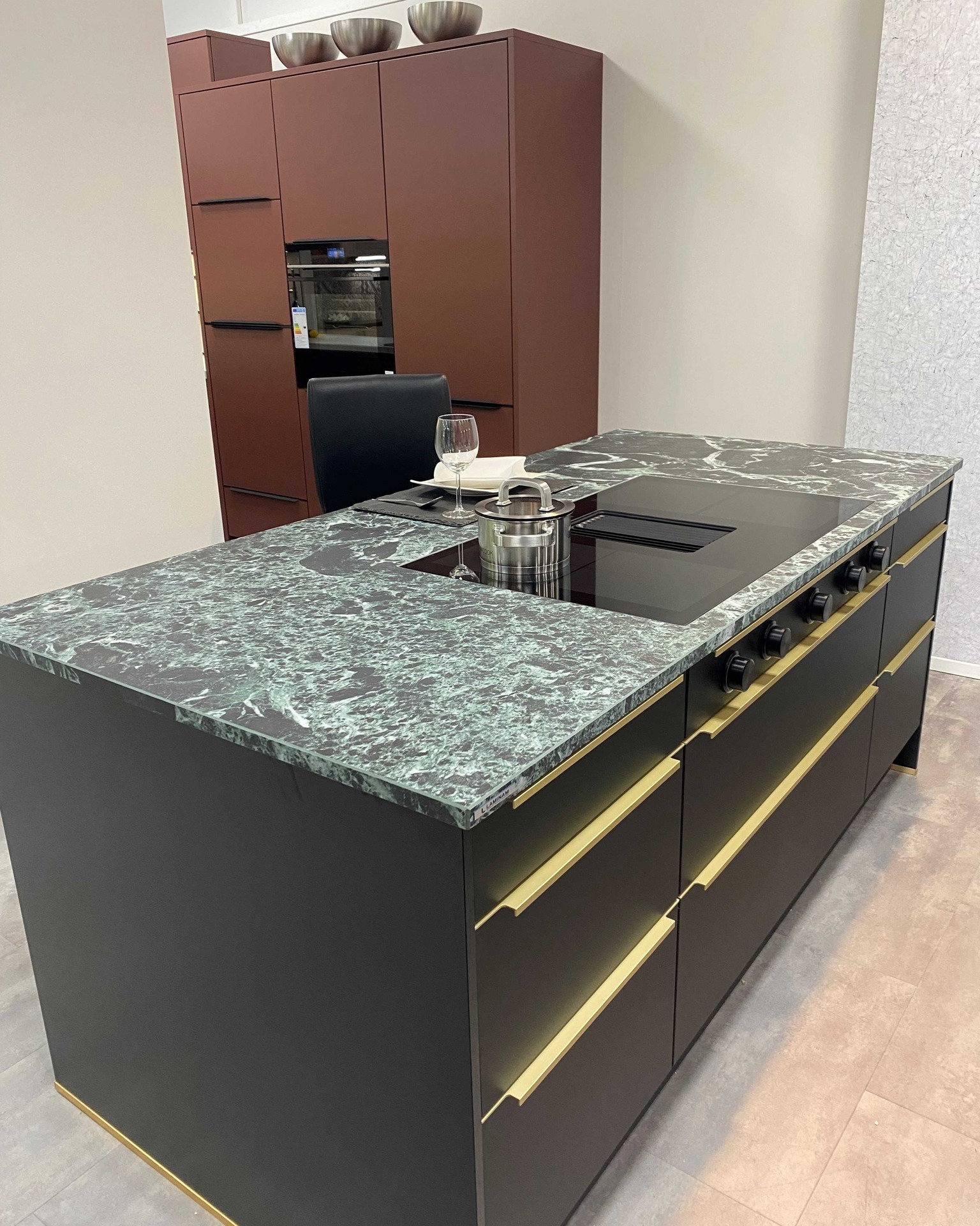Küchenträume werden wahr: Die Keramikarbeitsplatte und Rückwand in Laminam "VERDE ALPI" mit bocciardata Oberfläche - ist nicht nur optisch ein Highlight, sondern auch ein haptisches Erlebnis. Die flächenbündige Integration von Kochfeld und Spüle sorgt für nahtlose Eleganz. Goldene Akzente an Griffen und Armatur, kombiniert mit anthrazitfarbenen und holzfarbenen Fronten, verleihen der Küche den perfekten Glamour-Touch. ![]()