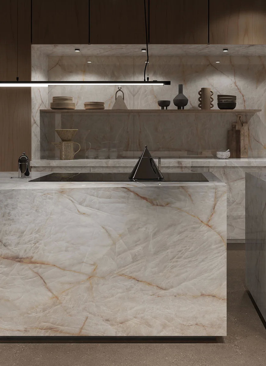 Die Ästhetik von Arabescato Diva zollt einem der ikonischsten italienischen Marmore Tribut und feiert die Seltenheit edler Materialien, um eine kraftvolle visuelle Wirkung zu erzeugen. Die helle, leuchtende Oberfläche mit goldenen Adern vereint anspruchsvolles Design mit technischer Innovation.