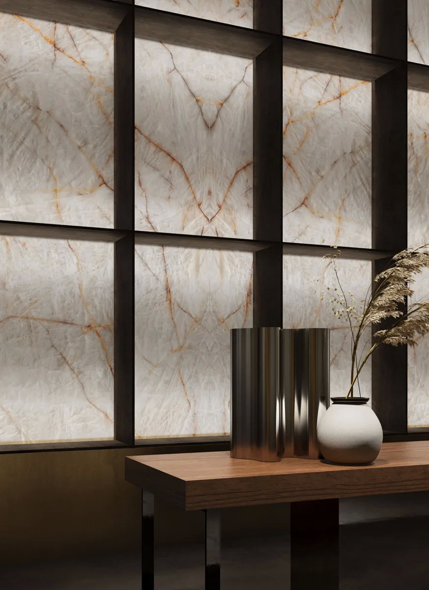Dreidimensionalität, die sich mit Licht entwickelt Eine Oberfläche, die zwischen kristallinen Reflexen und bernsteinfarbenen Details changiert. Crystal Clear interpretiert die Struktur von Kristall mit einem reinen, eisigen Hintergrund neu, durchzogen von fließenden, unregelmäßigen Bernsteinadern. Eine skulpturale Oberfläche, die ihr Erscheinungsbild mit dem Licht verändert und ausdrucksstarke, leuchtende Räume mit starker sensorischer Wirkung schafft.