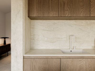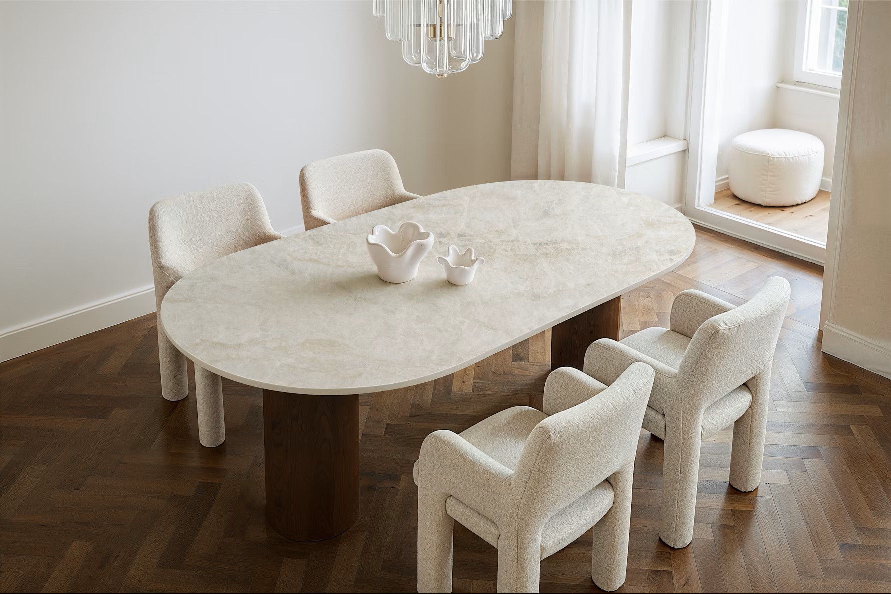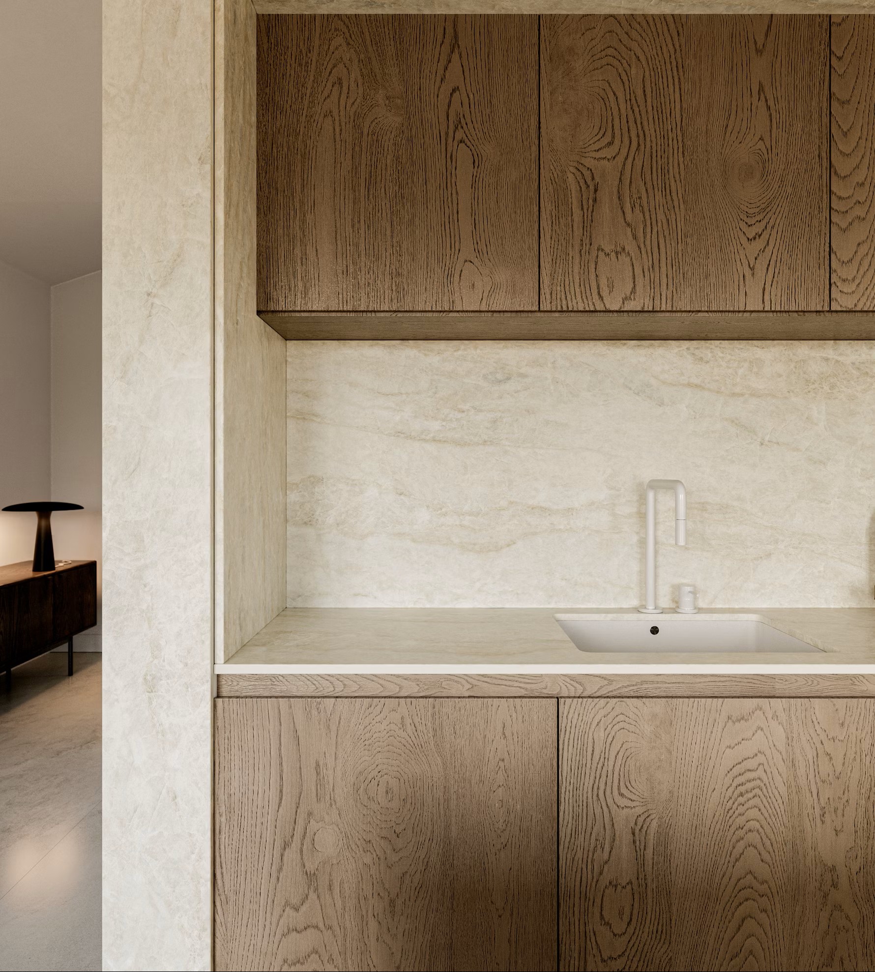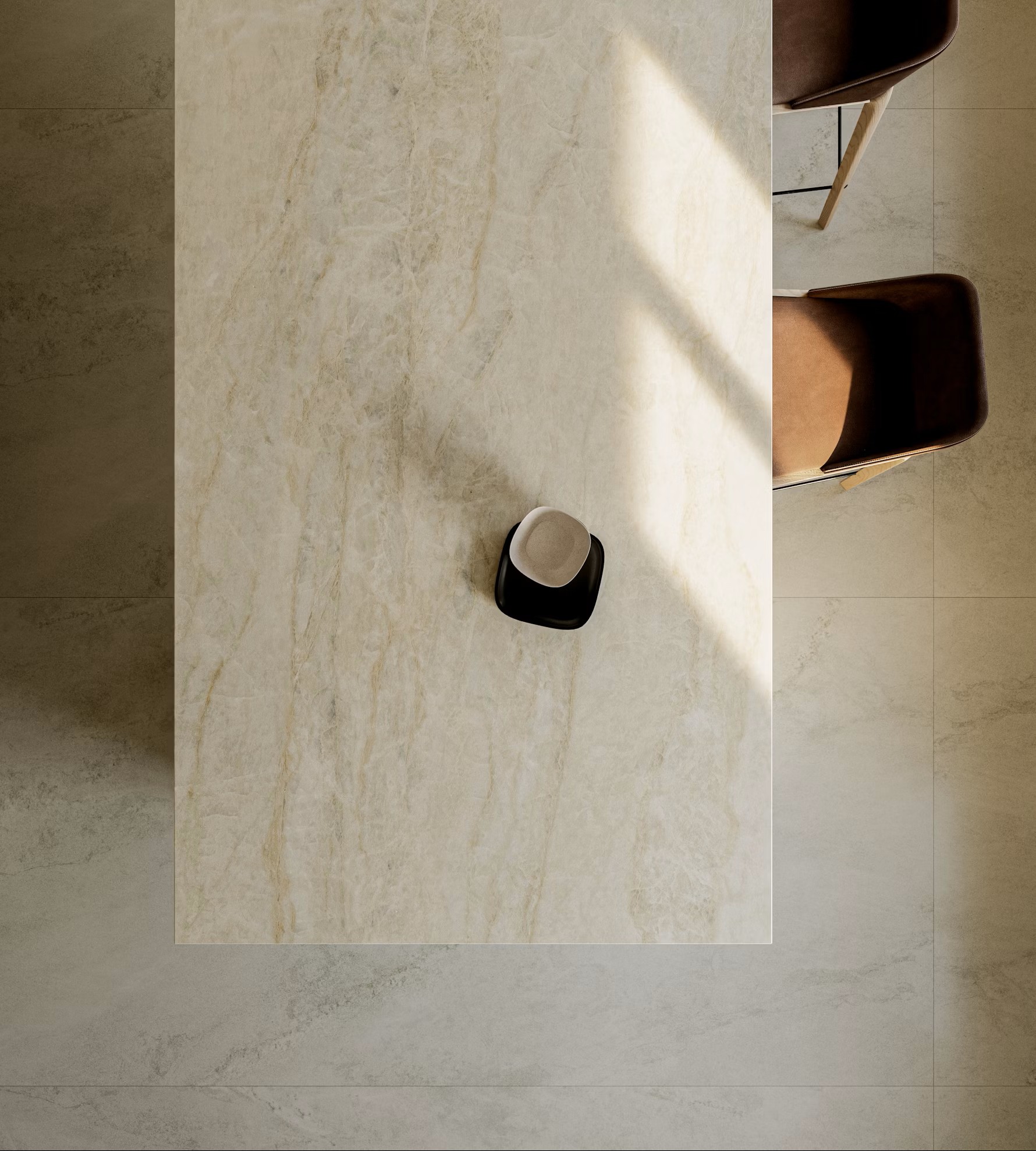 Inspiriert von der ruhigen Schönheit der Natur kombiniert Nara die Wärme von Beigetönen mit einem sanften und umhüllenden Design. Seine subtilen Maserungen auf einem leuchtenden Hintergrund interpretieren die zeitlose Eleganz des Taj Mahal-Quarzits mit einem zeitgenössischen Ansatz neu. Die seidige Oberfläche verstärkt seinen ruhigen und anspruchsvollen Charakter und lädt mit einer Textur, die Harmonie vermittelt, zum Berühren ein. Ein ausgewogener und vielseitiger Vorschlag, ideal für Räume, die einen Hauch von Raffinesse suchen.