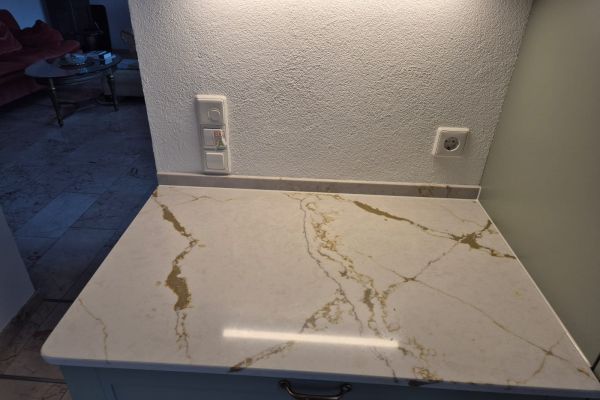 Elegante Küchenlösung mit 2cm Silestone „Versailles Ivory“, poliert.
