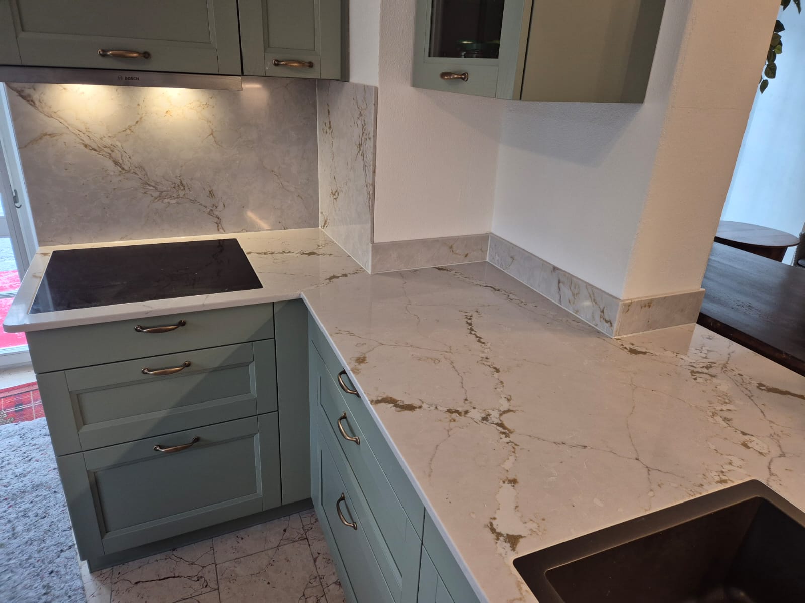 Kochfeld und Spüle sind flächenbündig integriert und sorgen für eine klare, moderne Optik.