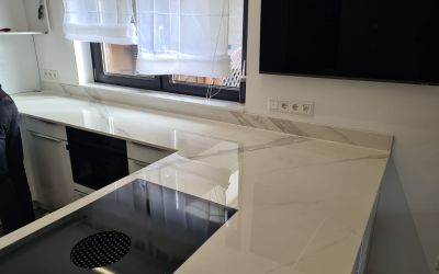 Eine Arbeitsplatte aus Dekton OLIMPO in Xgloss verleiht Ihrer Küche oder auch Ihrem Badezimmer einen Hauch von zeitloser Eleganz. Das Dekor simuliert die Anmut und Schönheit von echtem Marmor, ohne die empfindlichen Eigenschaften des Natursteins zu haben.