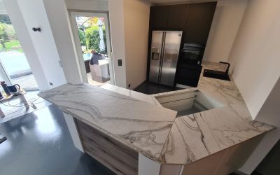 Eine Arbeitsplatte und ein Aufsatztresen aus Dekton "LIQUID SKY" sind nicht nur praktisch, sondern auch ein Statement in modernem Design.