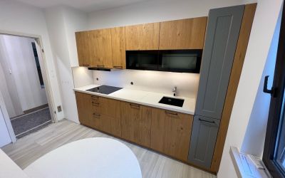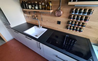 Die Kombination aus der dunklen NERO ASSOLUTO Arbeitsplatte, weißen Möbeln und einem Holzpaneel als Rückwand schafft einen reizvollen Kontrast. Die weißen Möbel verleihen der Küche Helligkeit und Frische, während das Holzpaneel für Wärme und Gemütlichkeit sorgt.