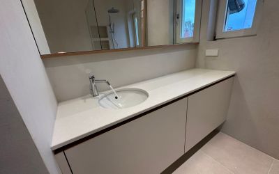 Eine Waschtischplatte aus Silestone YUKON mit einem Unterbaubecken ist eine ästhetische und praktische Lösung für Ihr Badezimmer. Quarzkompositstein ist ein hochwertiges Material, das nicht nur wunderschön aussieht, sondern auch äußerst langlebig ist. Es verleiht Ihrem Badezimmer eine elegante, helle und zeitlose Ästhetik.