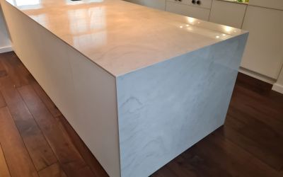Inselarbeitsplatte und Wange auf Gehrung verklebt