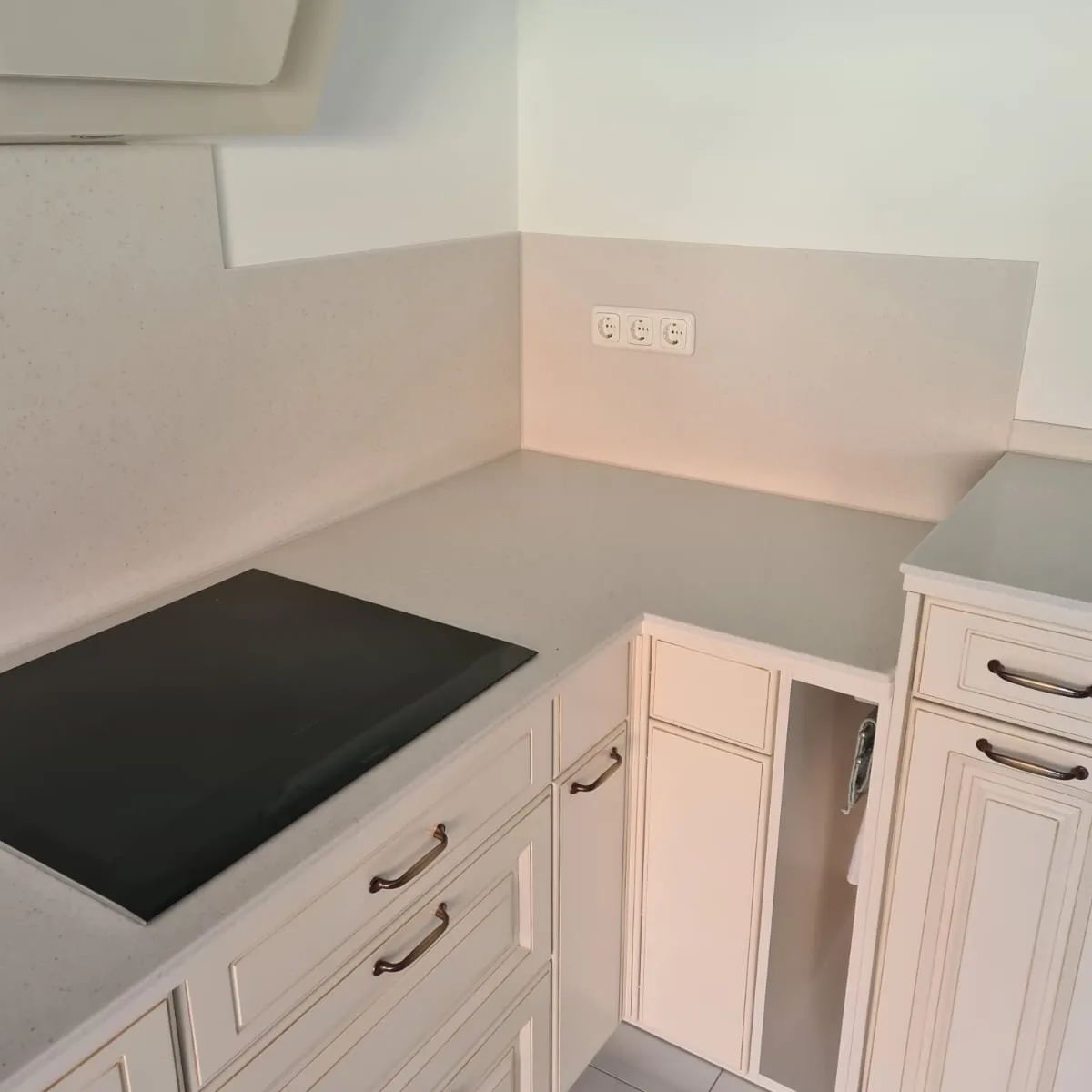 Arbeitsplatten und Rückwände aus Corian "Linen", 12mm stark, Spüle Unterbau, Kochfeld Auflage