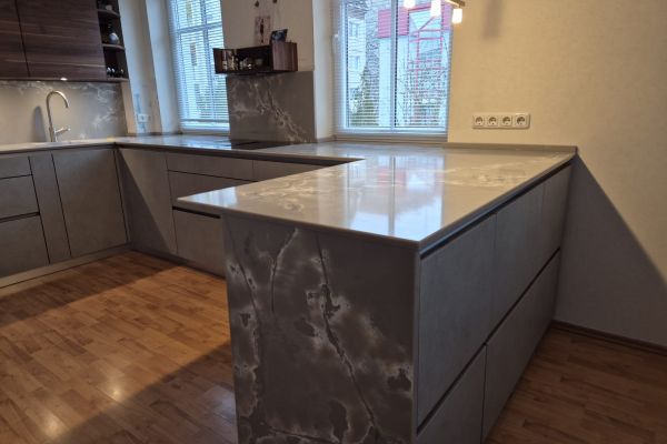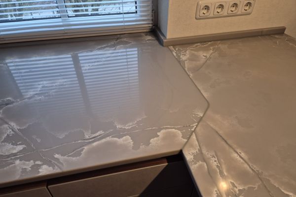 Arbeitsplatte, Wange und Rückwand aus Compac Ice White, 2 cm stark und poliert.