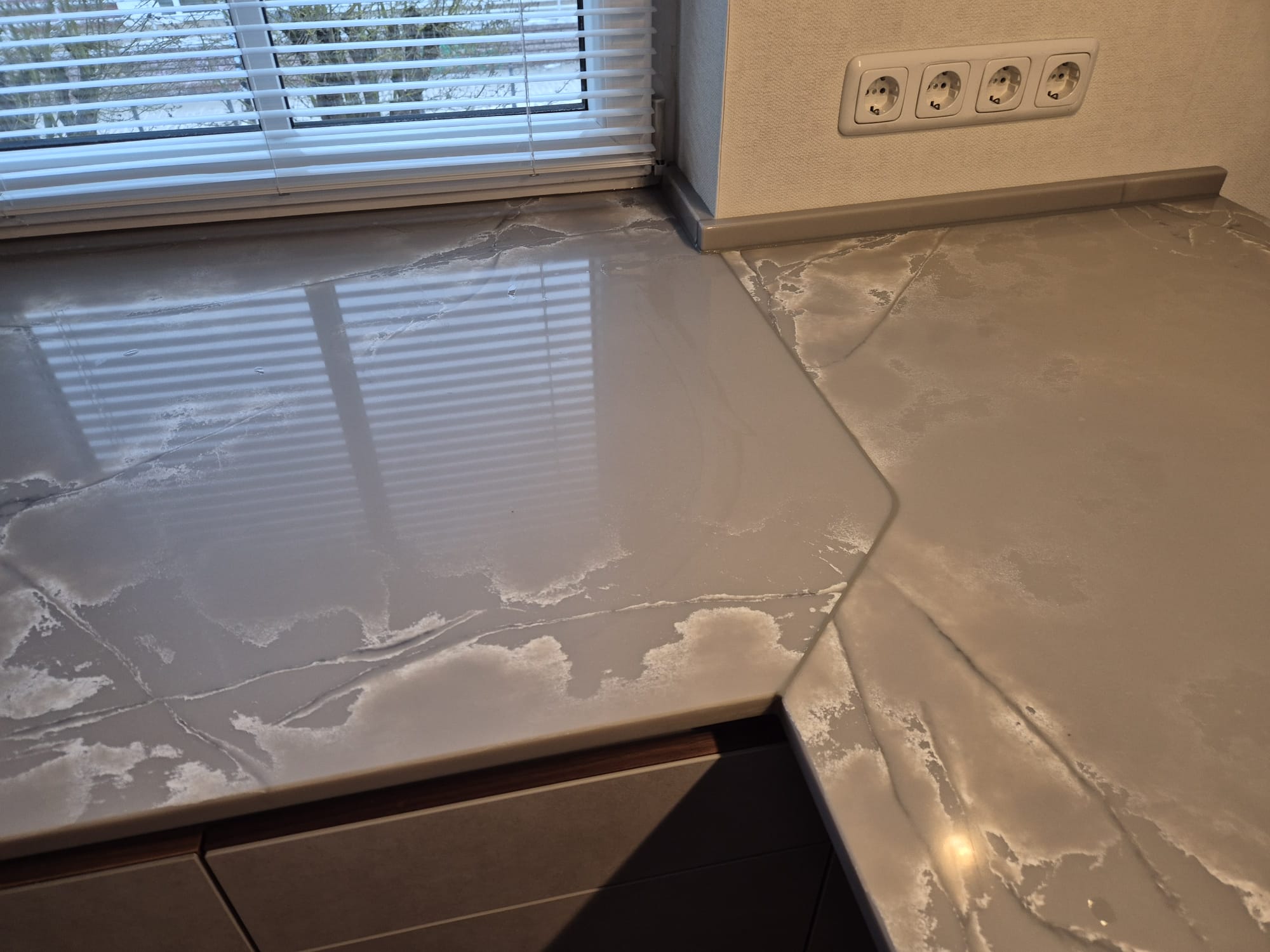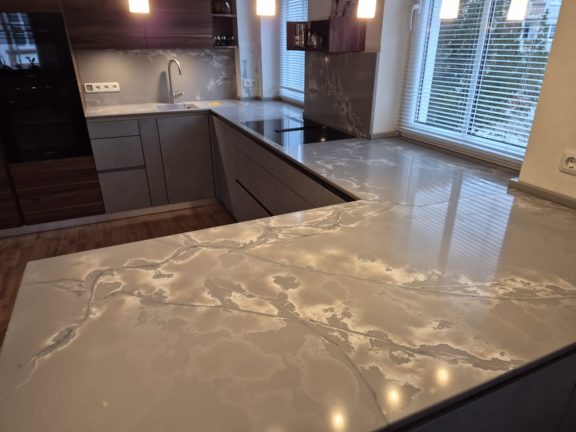 Die Übergangsfuge zur Insel ist als Schwanenhals ausgebildet, sodass die Fuge nicht direkt ins Fenster läuft – funktional und durchdacht bis ins Detail.