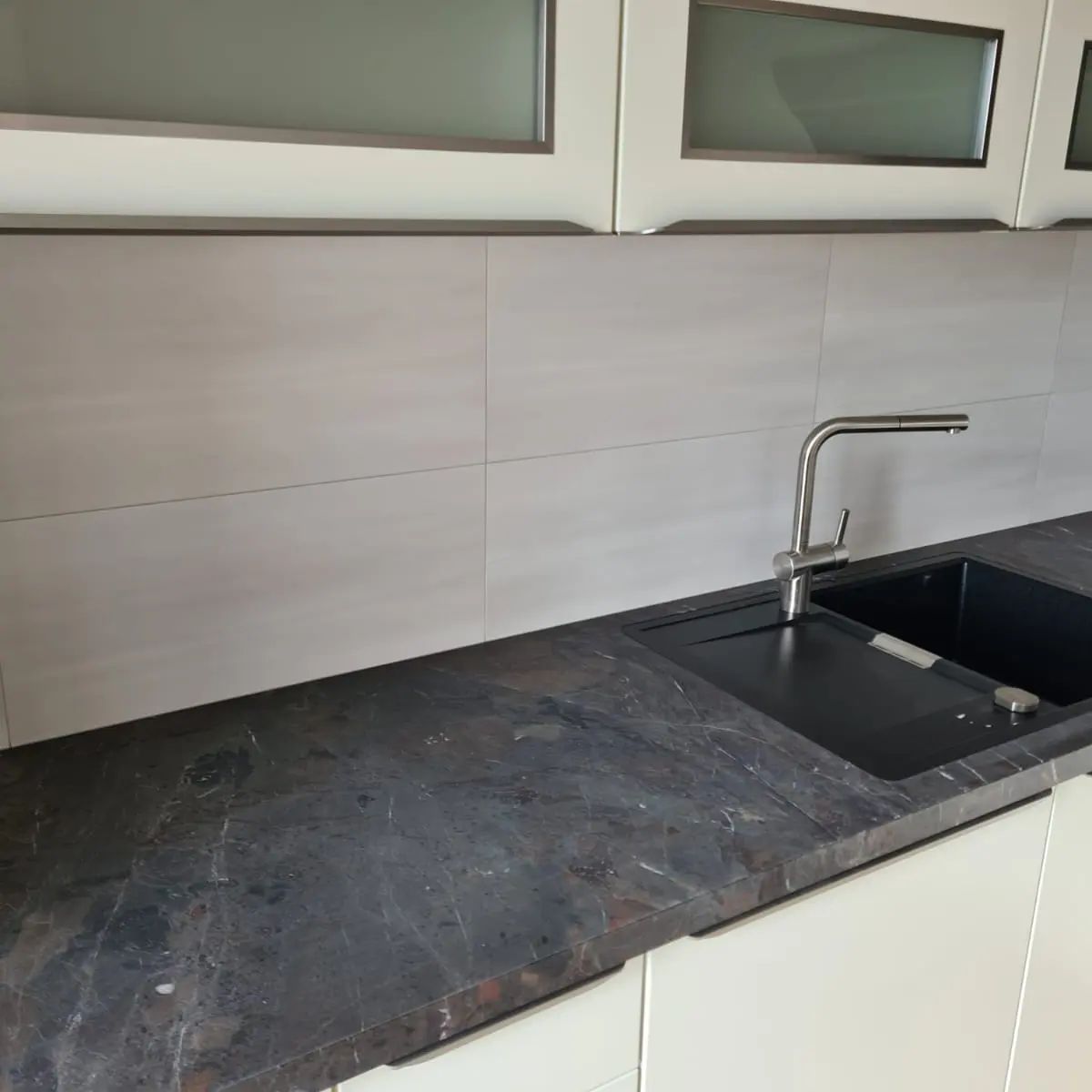 Arbeitsplatten aus Naturstein "Breccia Imperiale", Oberfläche satiniert, mit 4cm Gehrungskante, Kochfeld und Spüle flächenbündig verbaut.